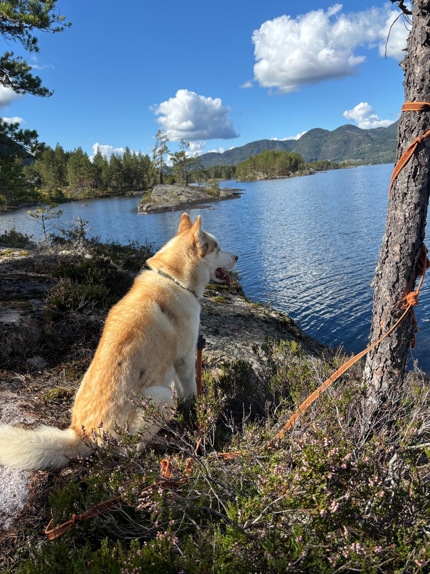 Jeg måtte vente over 50 år på å få ønsket oppfylt (vel, delvis). Våren 2021 kom Sherpa inn i livet vårt. Til daglig bor han med Andreas i Vadsø - 250 lange mil unna - med Finnmarksvidda som sitt "revir" (presiserer at han deler det med reinsdyr, havørn, mus og harer, altså). I 4 uker i august/september skulle vi være primærpersoner for 4-åringen. Hvordan ville Villmarkens sønn tilpasse seg mer urbane forhold og litt mindre "bevegelige" besteforeldre?