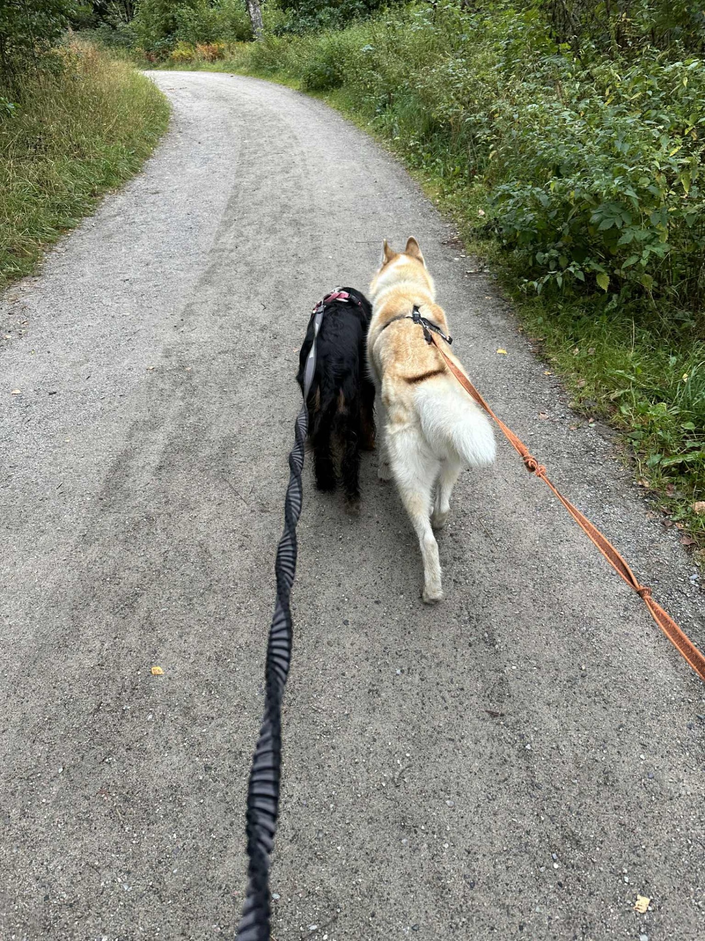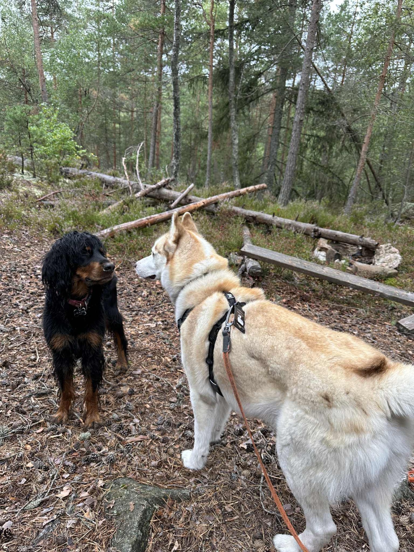 I Gulsetmarka ble det tur med enda ei venninne, Lotta. Det er ikke båndtvang. så Lotta kunne løpe løs en del. Den sjansen torde jeg ikke ta med Sherpa. (Foto: Lottas mamma Elin), selv om han kommer på kommando. Også er det jo dette med at han ikke er min hund, da, man føler på ansvaret.