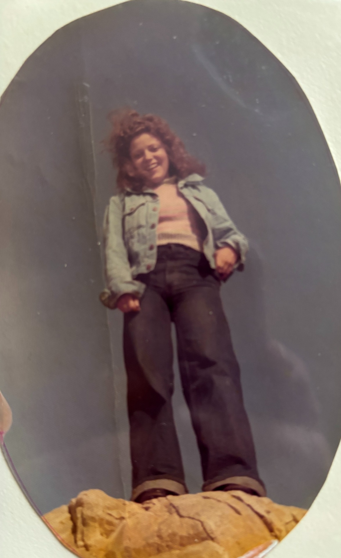 Tidlig 70-talls utgave i selvstrikket mini-genser (klødde aldeles grusomt) , lånt ola-jakke og nyinnkjøpte Wrangler-jeans (og det var lenge siden jeg hadde klippet håret)