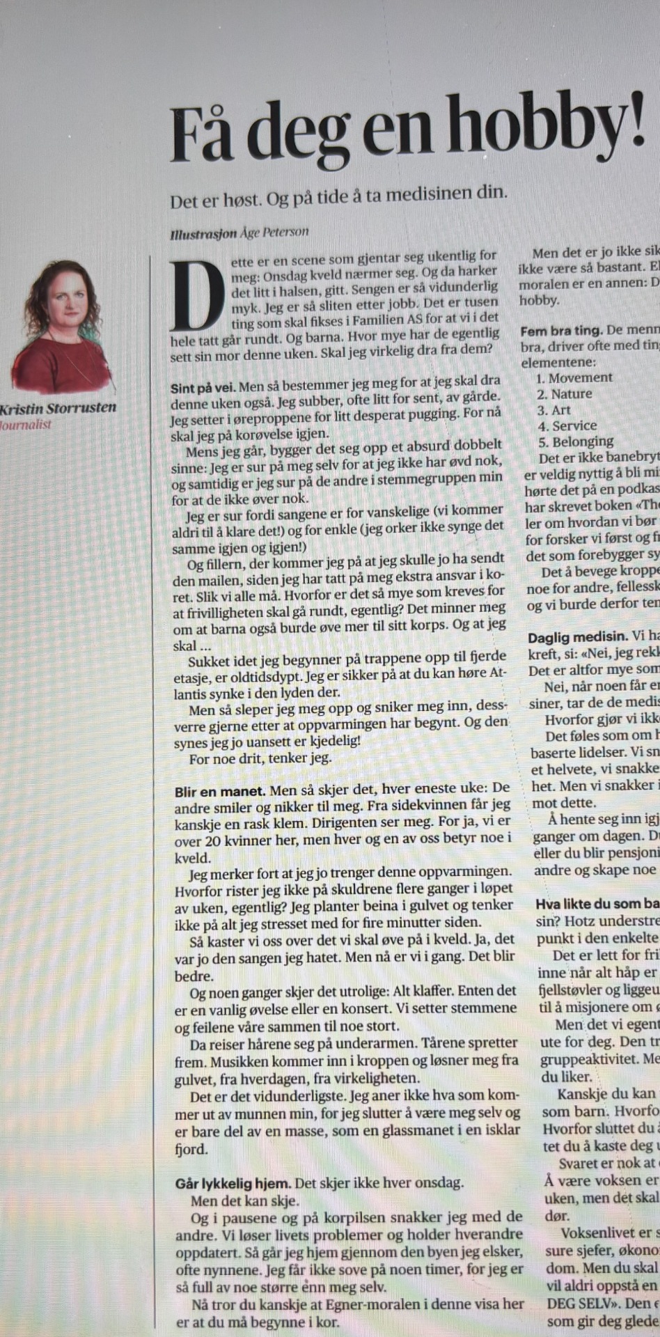 Gjenkjennelsesfaktoren er stor. I likhet med artikkelforfatteren har jeg begynt å synge i kor, endogtil et kirkekor. Ikke nok med det - vi har også korøvelse på onsdagskvelder. Jada (I know....) der slutter likheten - er noen decennier siden jeg hadde barn i heimen- og betalt arbeid - for den saks skyld.